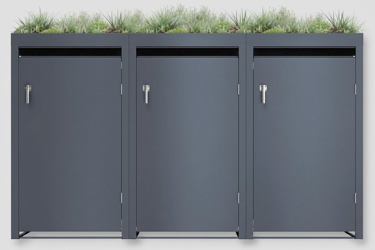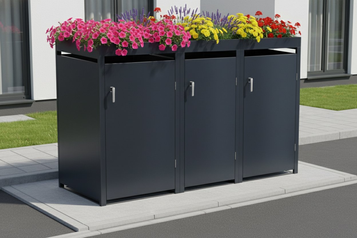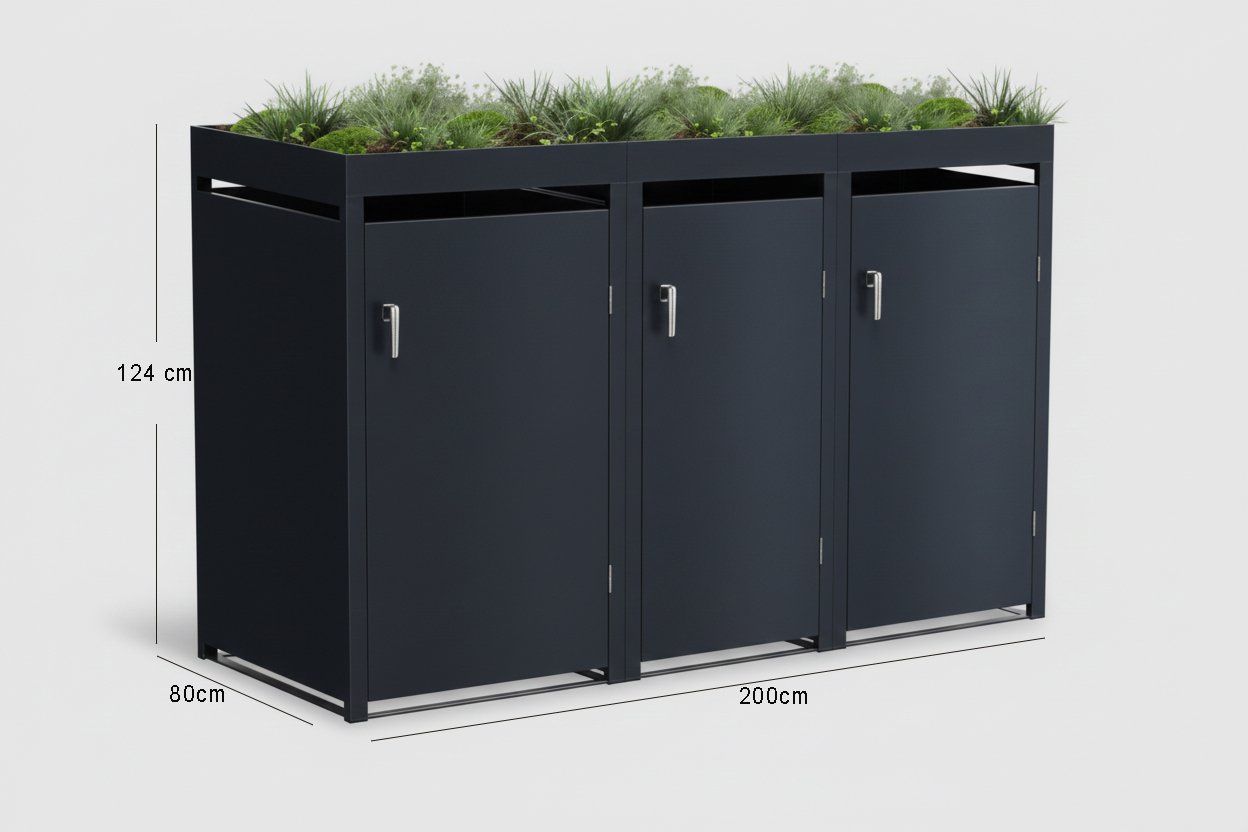A Metal Bin Shed with Planter offers the perfect solution for your home if you feel frustrated by messy bins ruining your curb appeal. This innovative triple-door enclosure hides three large containers effectively while providing a beautiful space for flowers or herbs directly on top. Furthermore, we focus on both style and durability so that this unit blends into your landscaping while providing long-lasting protection for your yard.